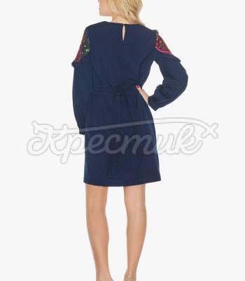 Модель платья практичная, однотонная. Для пошива выбрана костюмная ткань. Платье имеет прямой фасон, рукав ¾, который украшен принтом с рюшей. На спинке изделие застегивается на пуговицу. Форма горловины классическая, округлая. Великолепный вид такого наряда обеспечивают простой фасон и лаконичный дизайн.